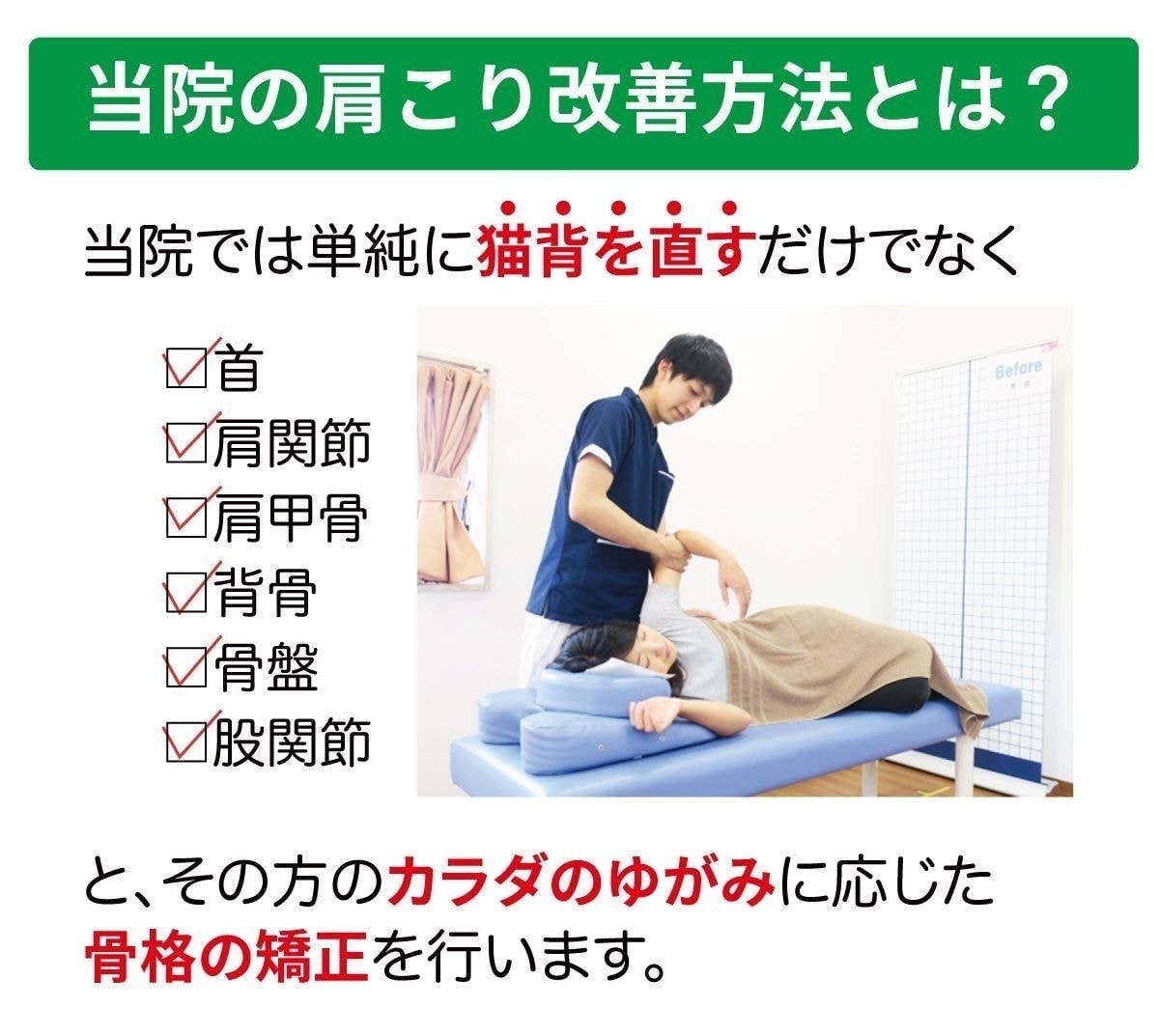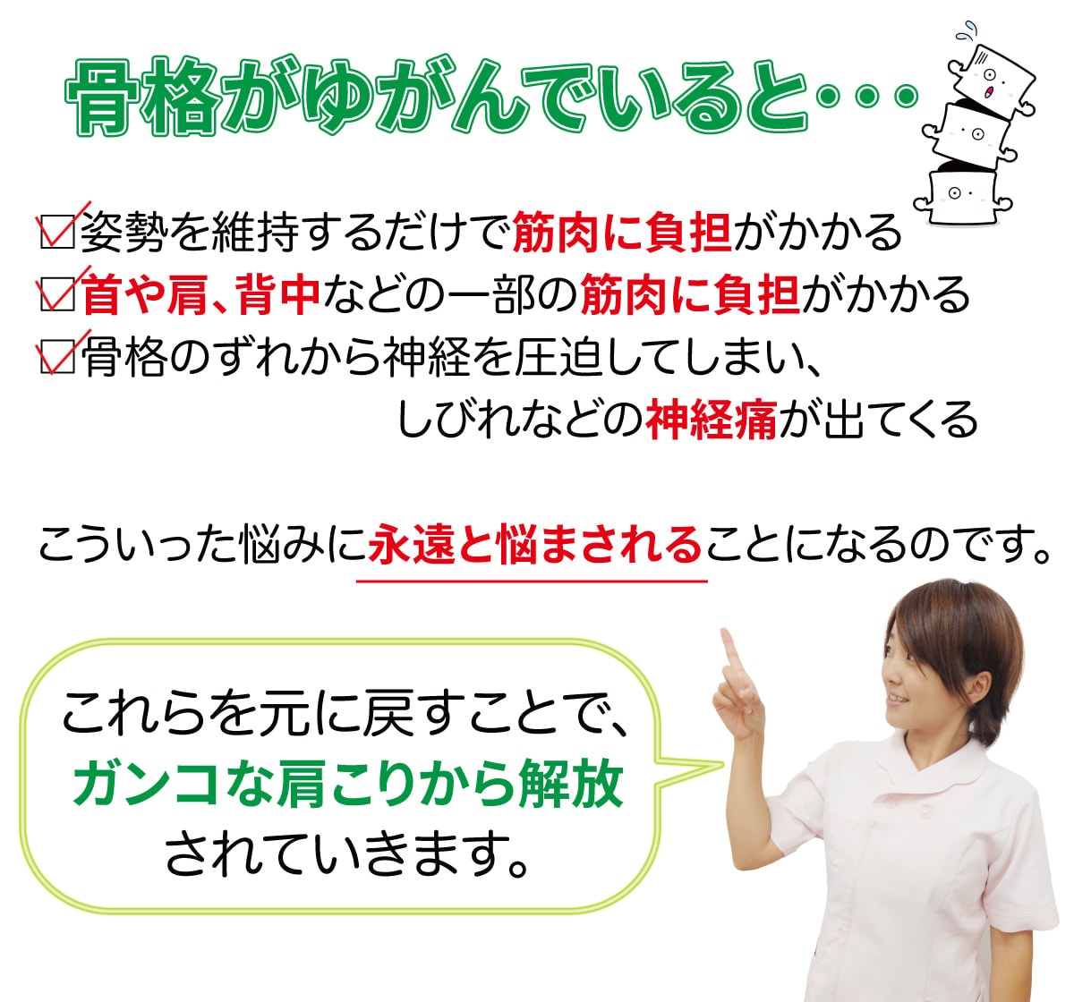 それは肩をマッサージすることではなく、それ以外の硬くなっている筋肉をほぐしてあげること、そして根本原因である「骨格の歪み」を整えることなのです。