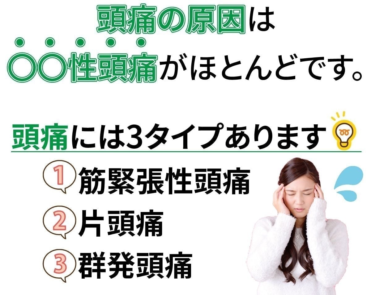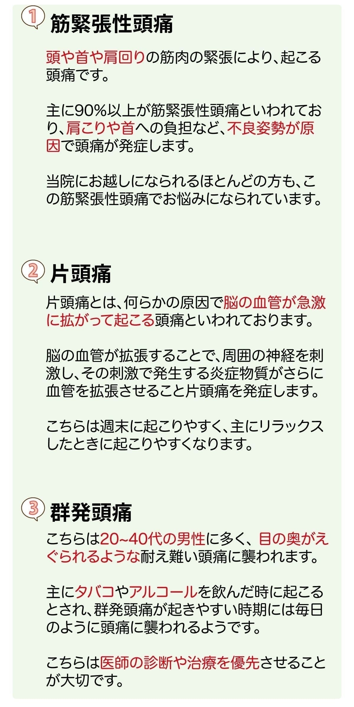- ①頭痛のタイプを見極め、患者様の状態に合わせたオーダーメイド治療を提供