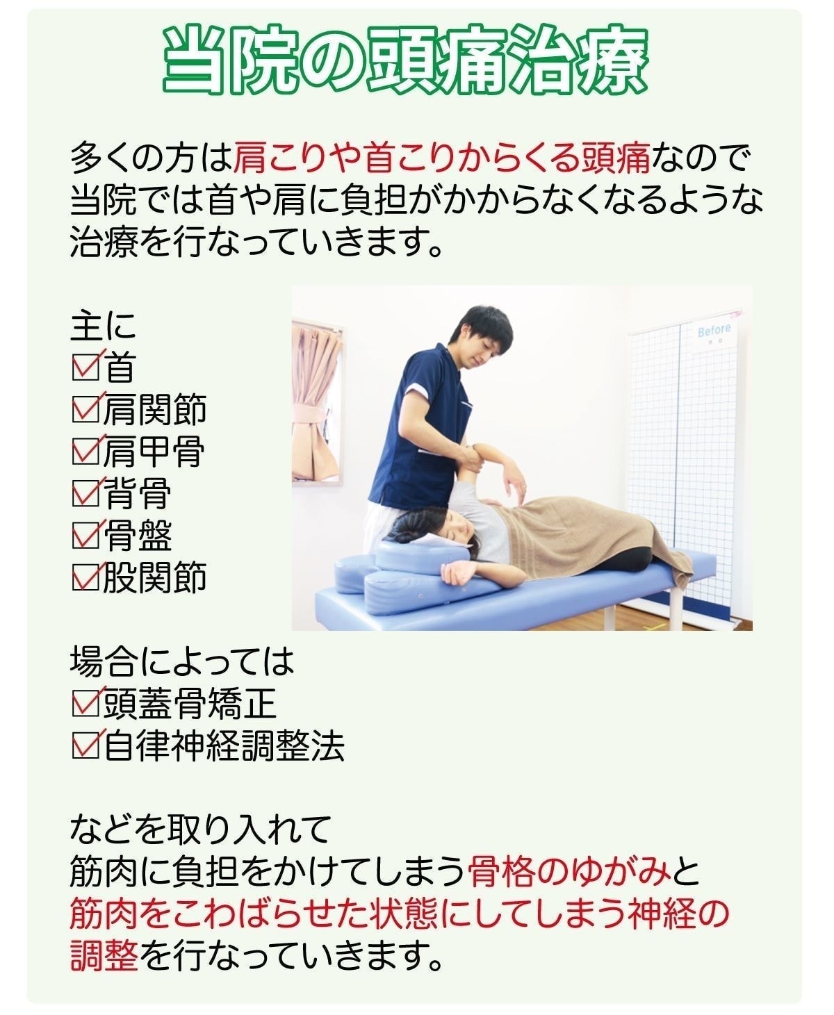 そのため、頭痛の治療とはいえ、肩こりをなくすような施術が中心になります。